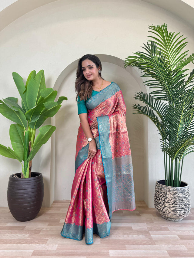 PURE TISSUE SILK SAREE WITH ZARI WEAVING AND MEENA WORK WITH RUNNING BLOUSE AND ELEGANT JAAL ON THE BODY.