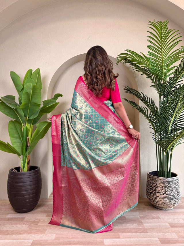 PURE TISSUE SILK SAREE WITH ZARI WEAVING AND MEENA WORK WITH RUNNING BLOUSE AND ELEGANT JAAL ON THE BODY.