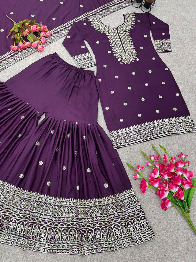Elegant Embroidery Sequence Work Purple Color Sharara Suit