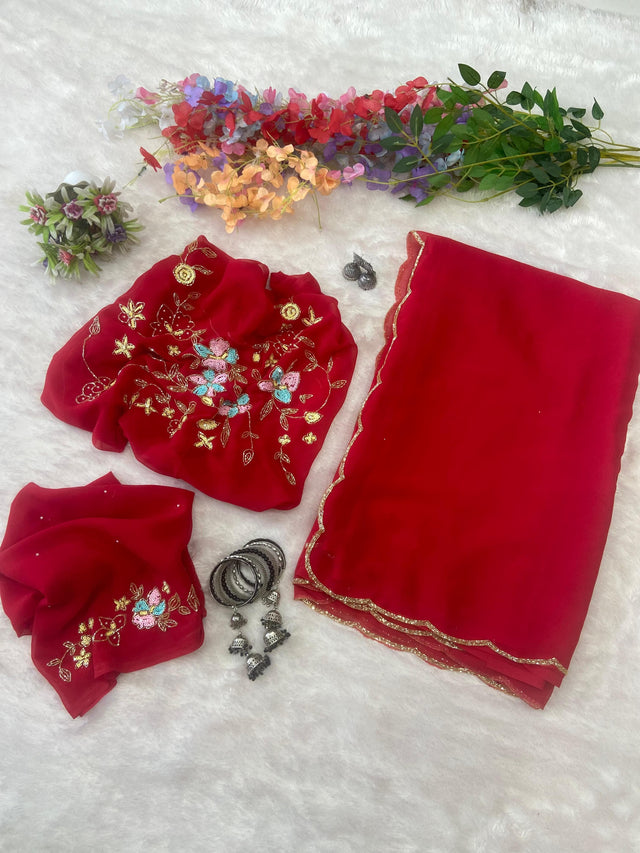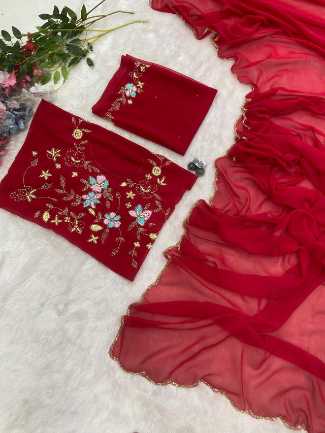 Elegant Georgette Hand Work Red Color Saree