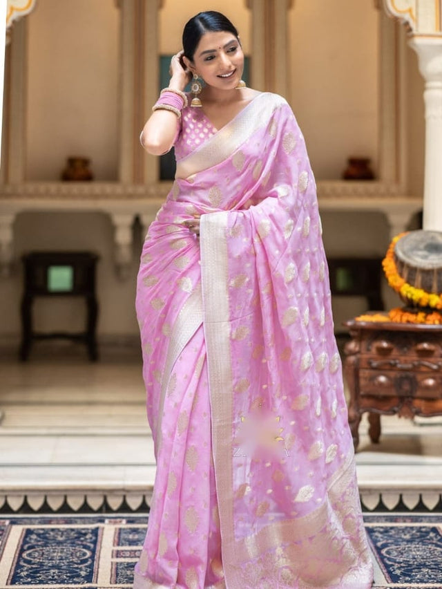 Embellished Baby Pink Color Jacquard Border Silk Saree