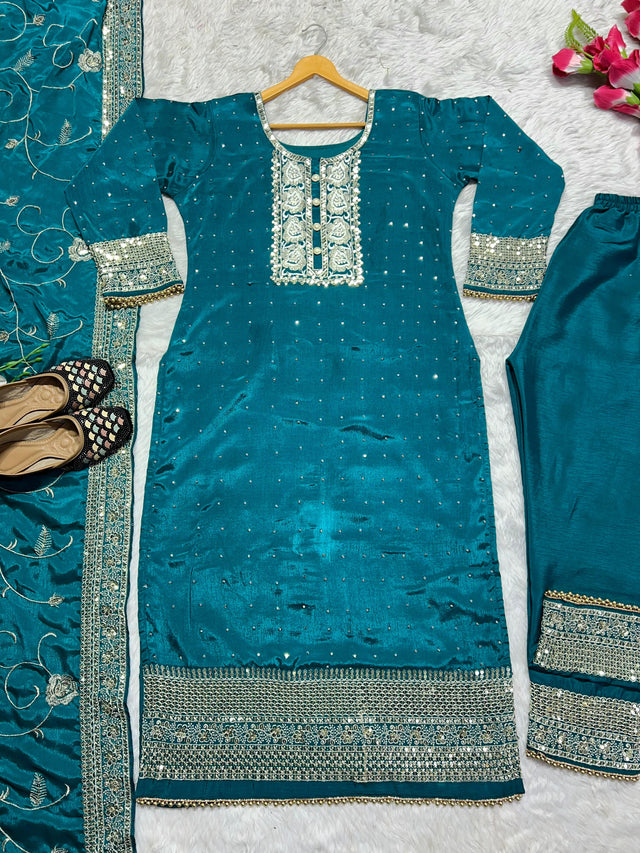 Embellished Embroidery Work Rama Color Anarkali Suit