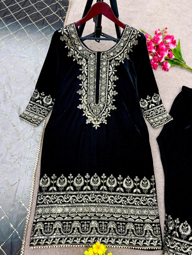 Embellished Embroidery Work Velvet Black Color Salwar Suit