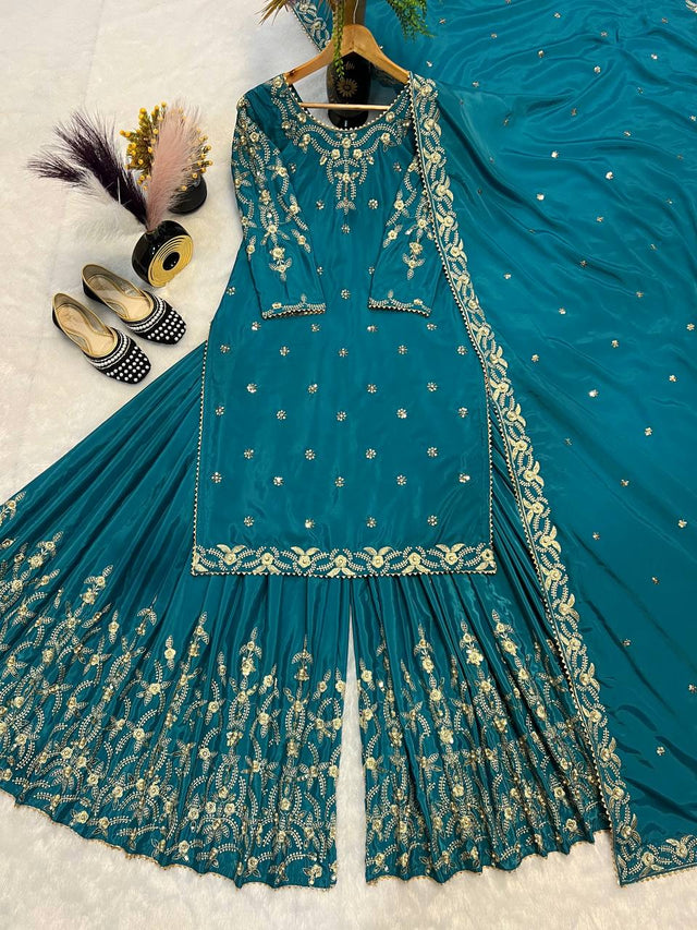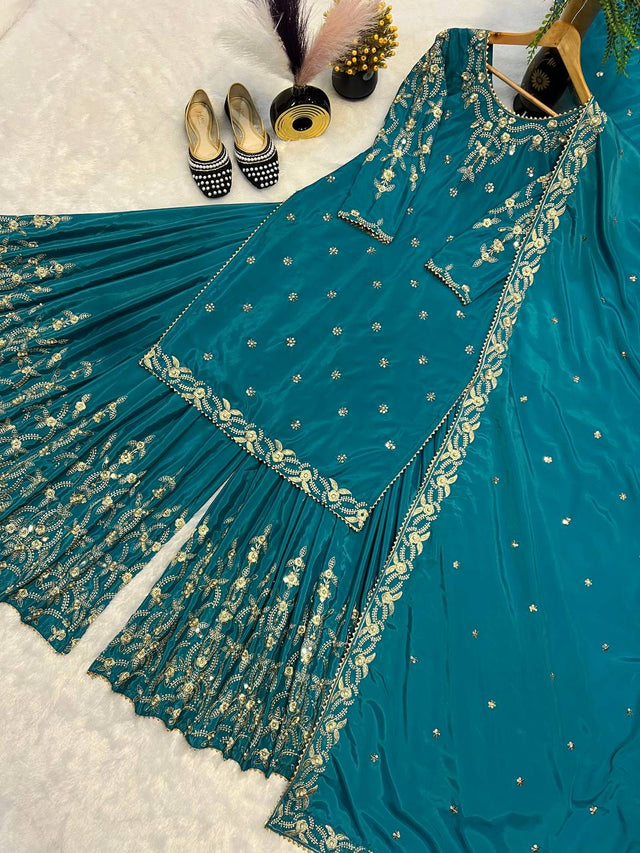 *Palazzo Fabrics* :Pure Heavy Natural Crepe Silk Heavy Embroidery Work With Moti Work Fancy Borders Less Work Fully Flair.