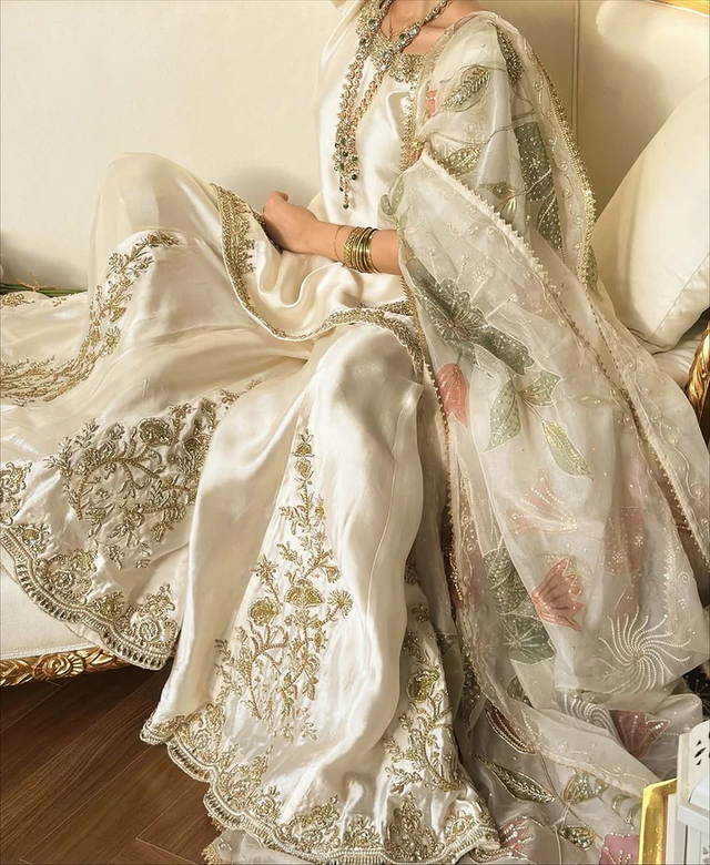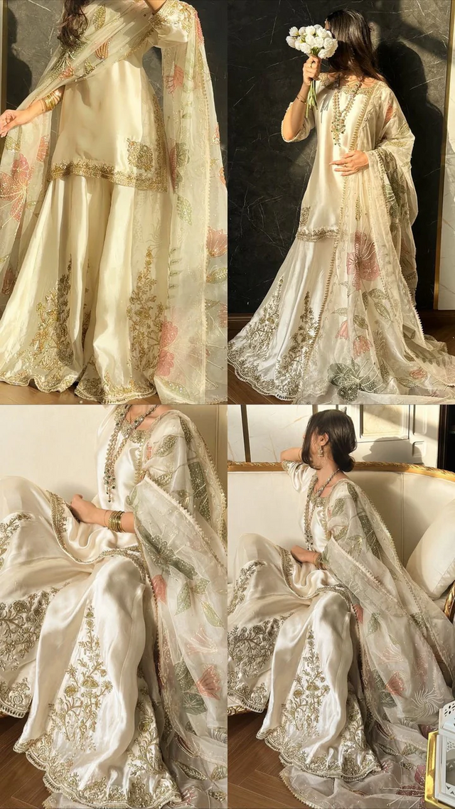 Turn heads this season with our Exclusive Heavy Chinon Gharara Suit, crafted with delicate sequence embroidery work for a luxurious festive look. The full-flair gharara, chic embroidered kurta, and a premium organza dupatta with digital print and heavy lace border make this outfit a true statement piece. 🌙💫
