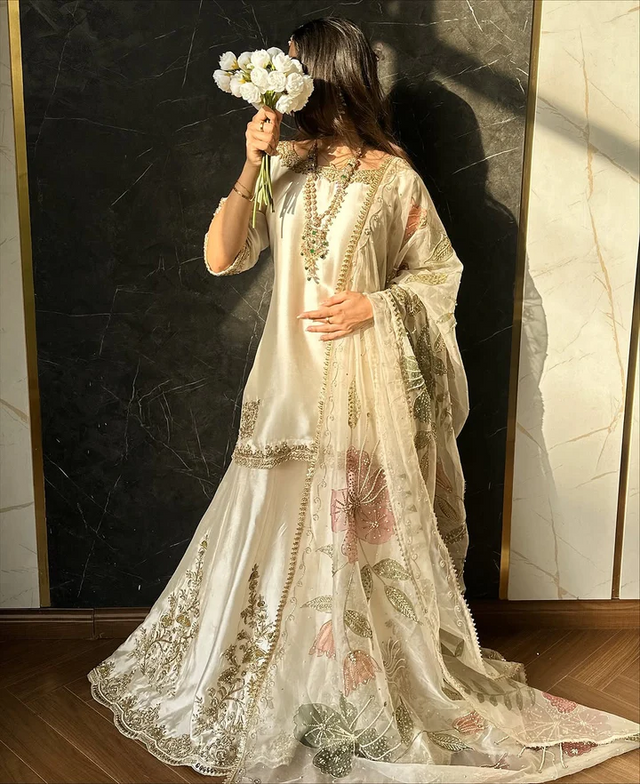 🌸 The heavy chinon fabric, sequence embroidery, full flair gharara, and organza dupatta with digital print make it a trending festive favorite.