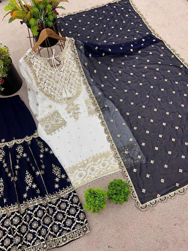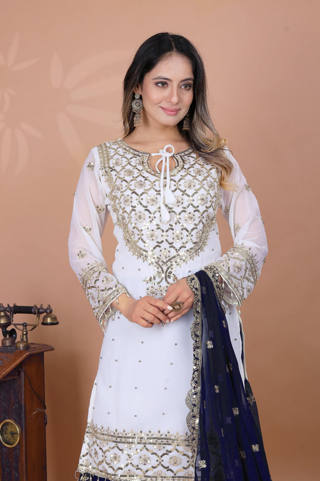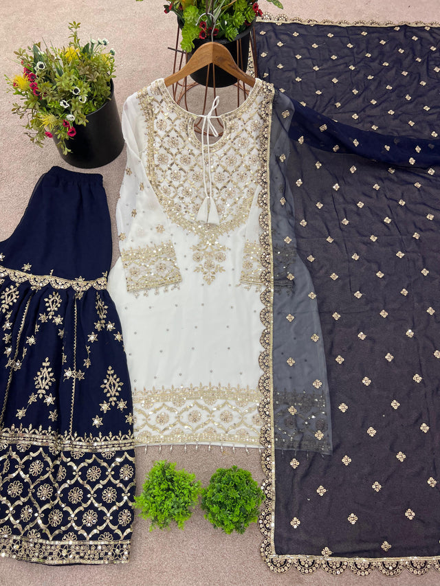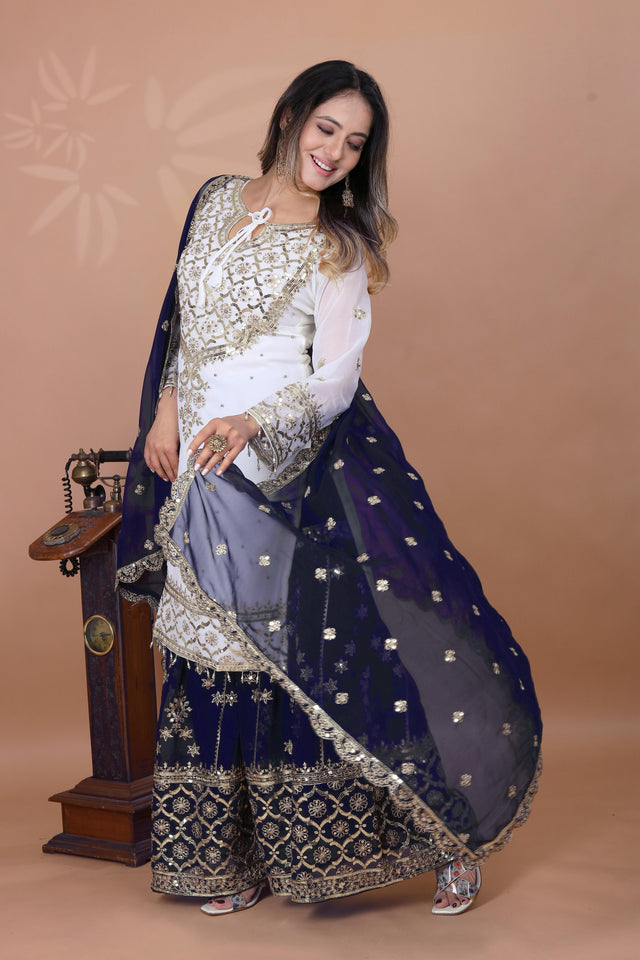 Fabulous Heavy Work White Color Suit With Navy Blue Sharara