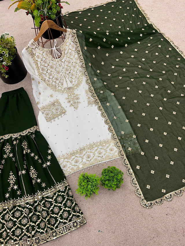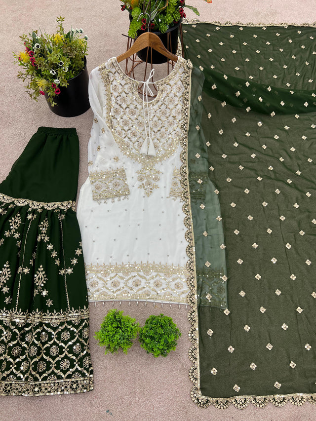 Fabulous Heavy Work White Color Suit With Mehndi Sharara