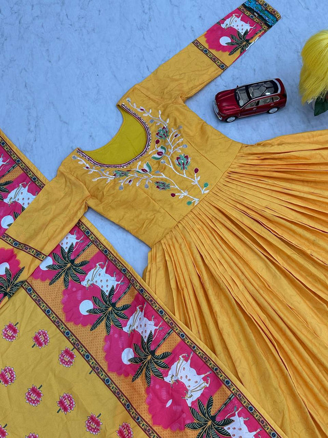 Fabulous Kalamkari Print Yellow Color Gown With Dupatta