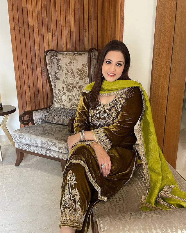 Fantastic Velvet Embroidery Work Mehndi Colour Kurti Set