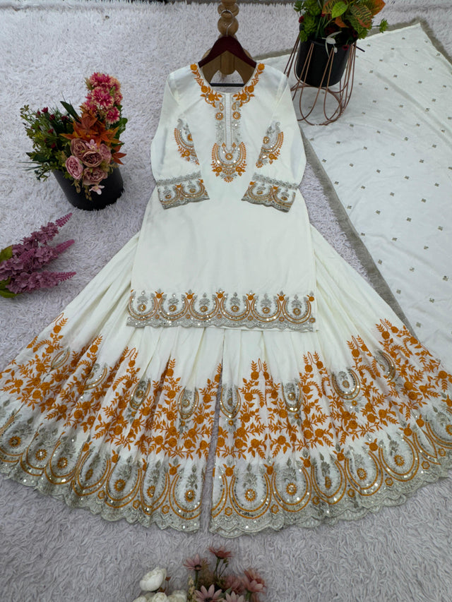 Festive Wear Embroidery Work White Color Sharara Suit