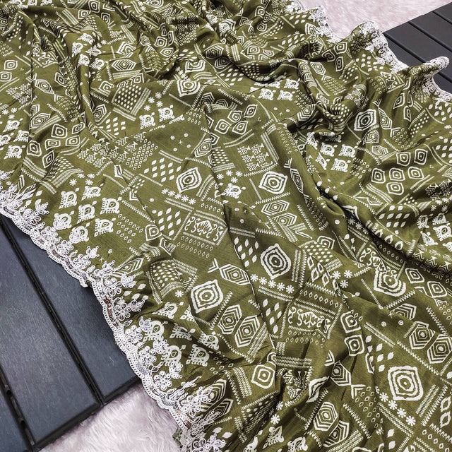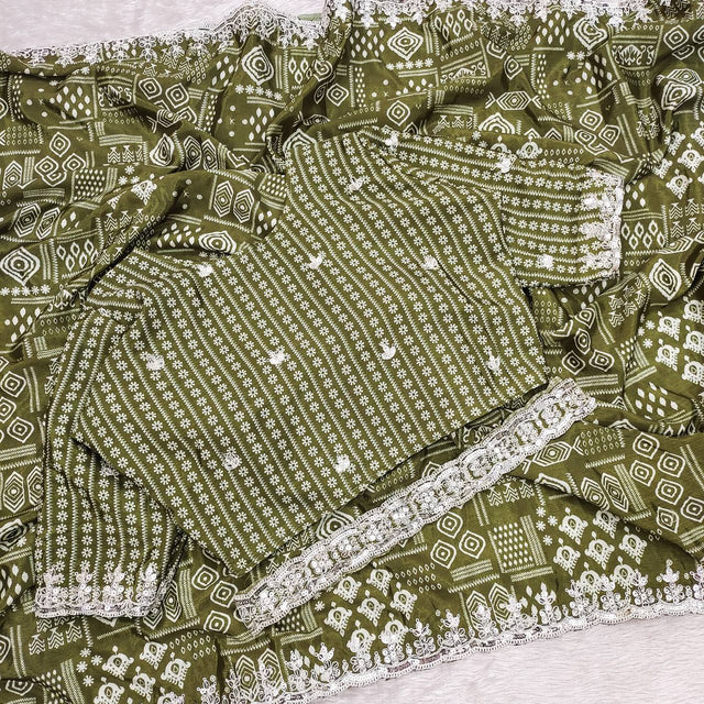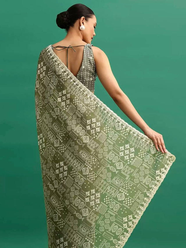 🥻 Sari Fabric: Premium Chinon Silk With Digital Prints & Embroidery Codding & Sequins Work With Fancy CutWork Border