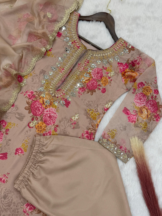 Flattering Sequence Heavy Stone Mirror Hand Work Beige Color Palazzo Suit