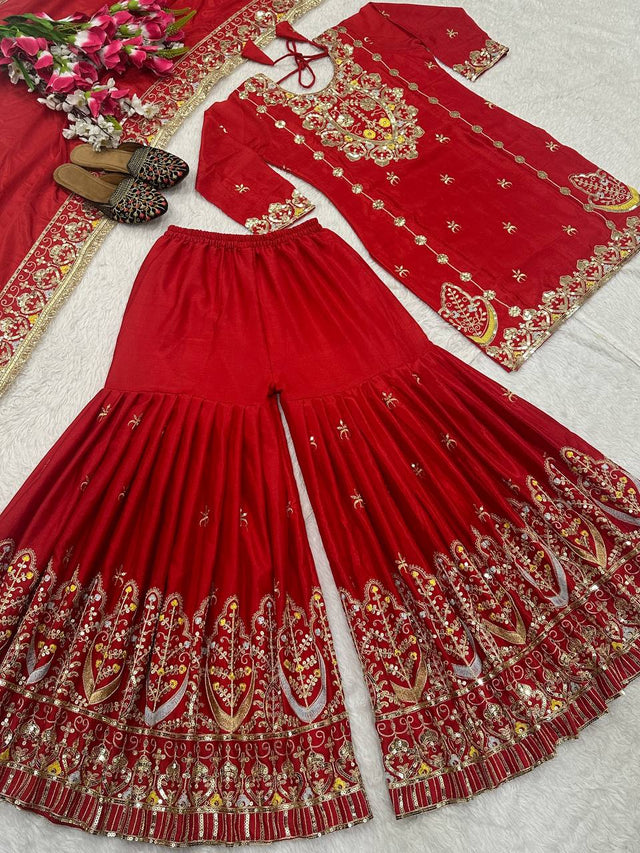 *Palazzo Fabrics* :chinon silk Heavy Embroidery Work With Fancy Borders Less Work Fully Flair.