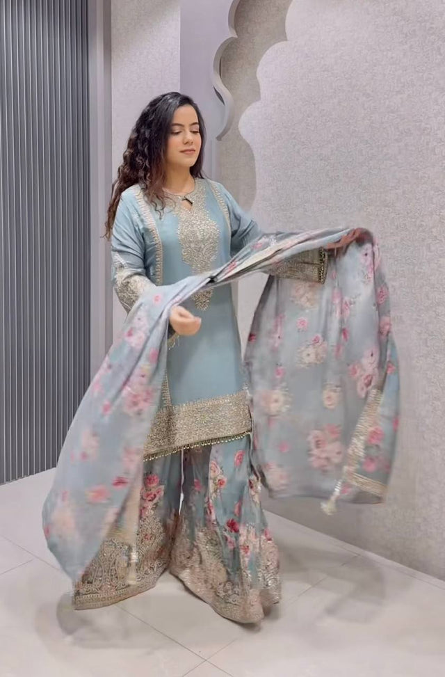 *Palazzo Fabric*: Heavy Chinon Silk With Digital Print With Embroidery 3 mm Sequence & Coding Dori Work With Elastic