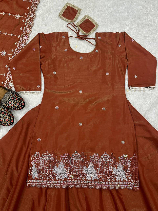 Function Wear Embroidery Work Brown Color Top With Lehenga