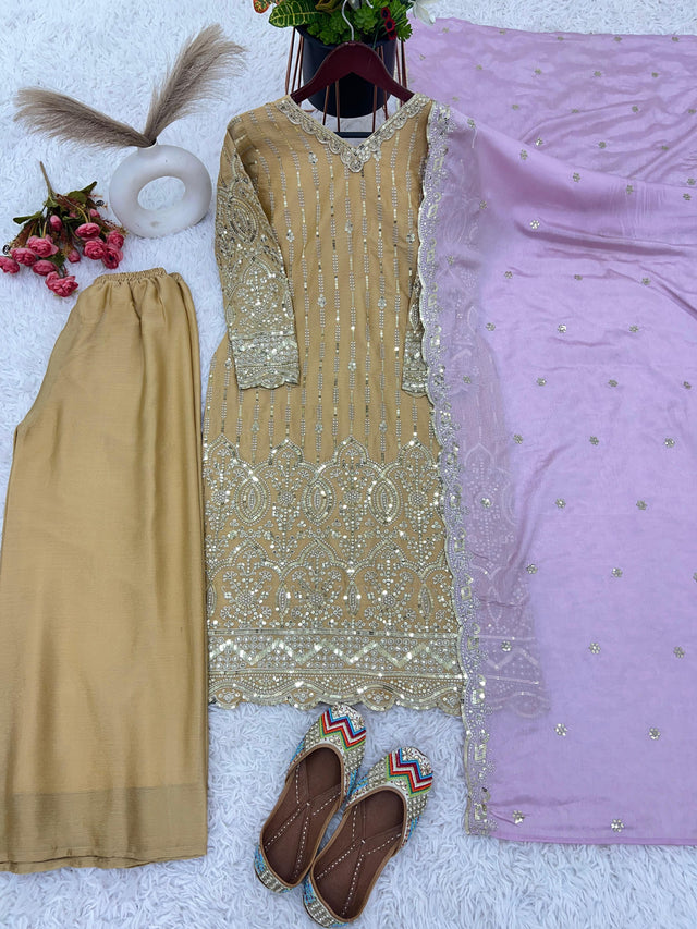 Function Wear Heavy Embroidery Work Beige Color Palazzo Suit