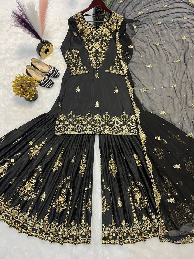 Function Wear Heavy Work Black Color Sharara Suit
