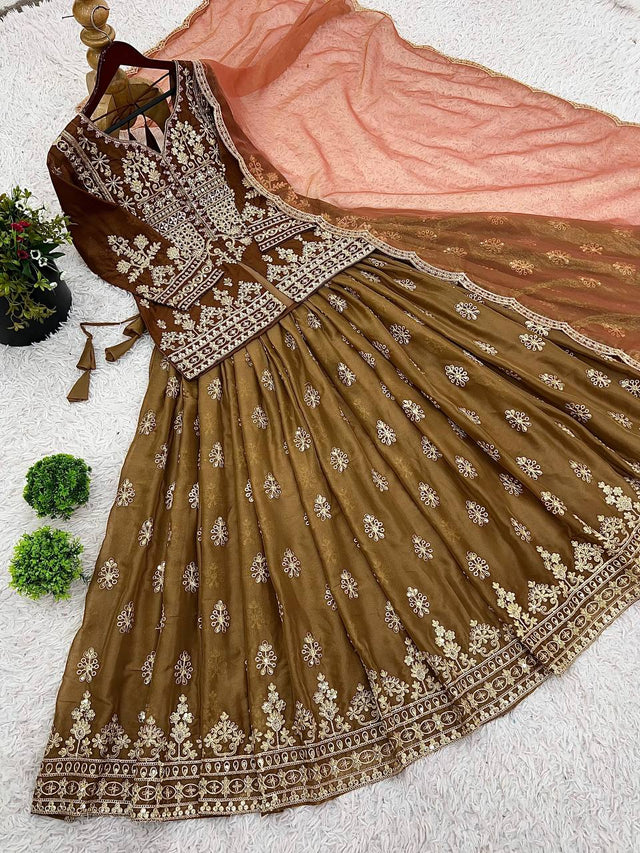 Georgette Embroidery Work Brown Color Top With Lehenga Choli