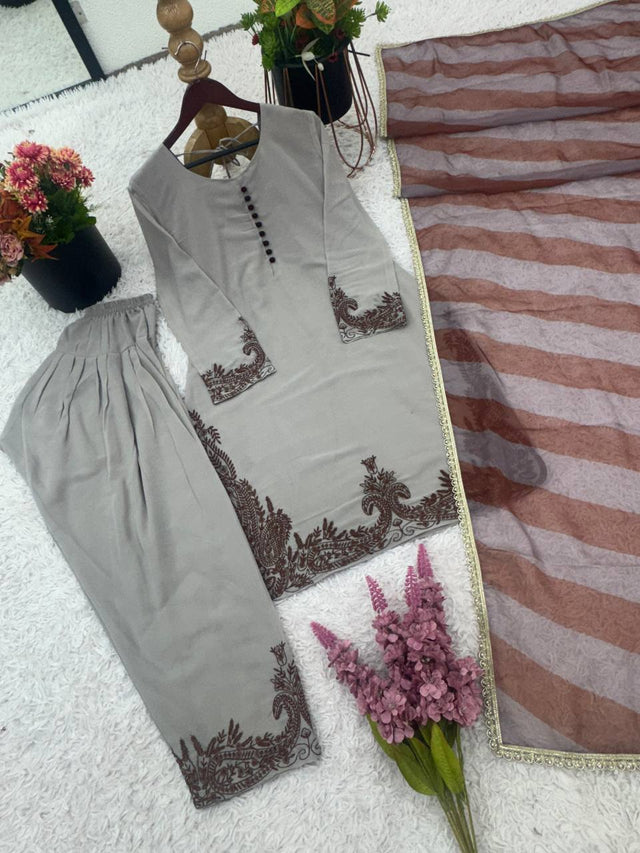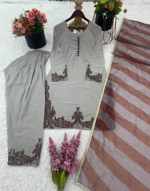 Georgette Gray Color Embroidery Work Straight Salwar Suit