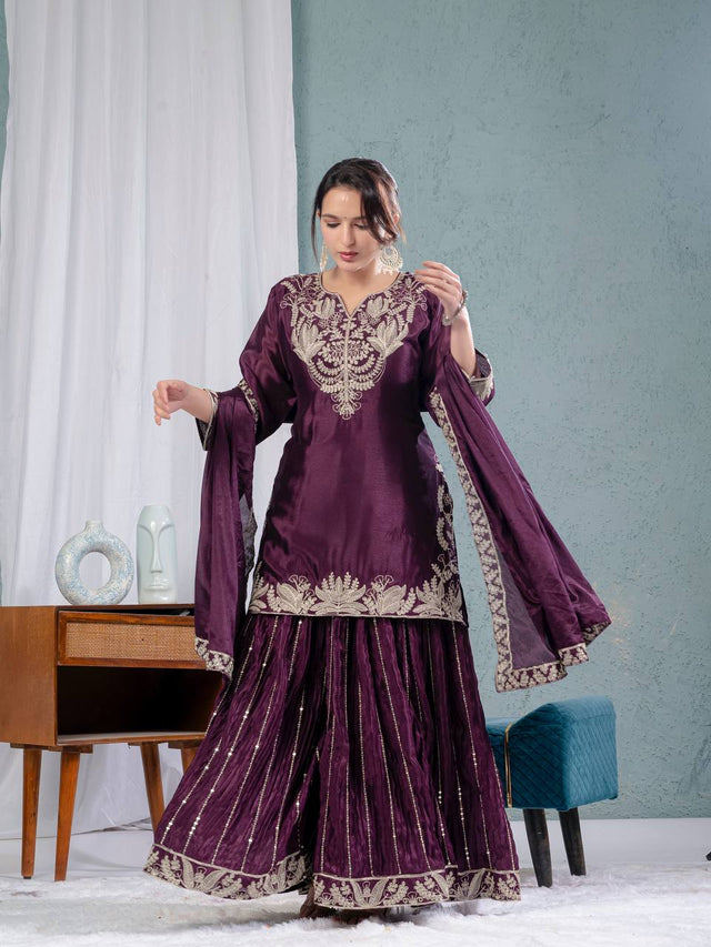 Glimmering Chinnon Silk Sequence Work Wine Color Sharara Suit