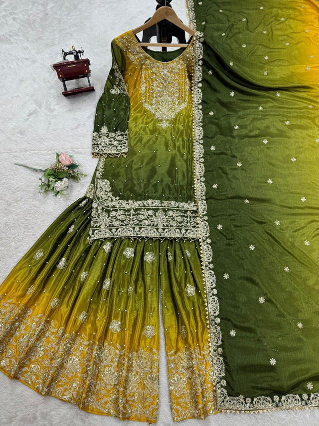 Glimmering Chinon Silk Double Shade Mehndi Color Sharara Suit