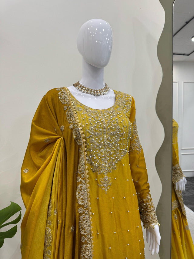 Glimmering Chinon Silk Double Shade Mustard Multi Color Sharara Suit