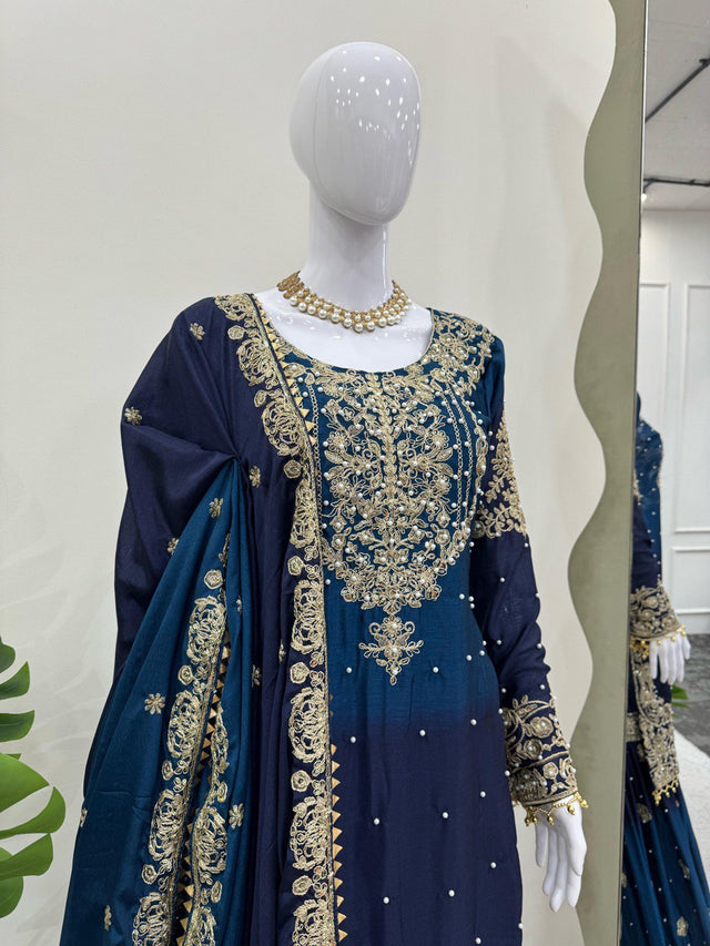 Glimmering Chinon Silk Double Shade Navy Blue Multi Color Sharara Suit