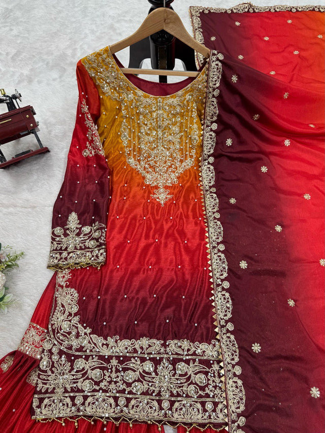 Glimmering Chinon Silk Double Shade Red Multi Color Sharara Suit