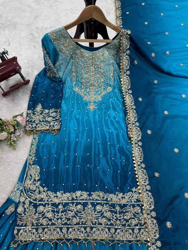 Glimmering Chinon Silk Double Shade Sky Blue Color Sharara Suit