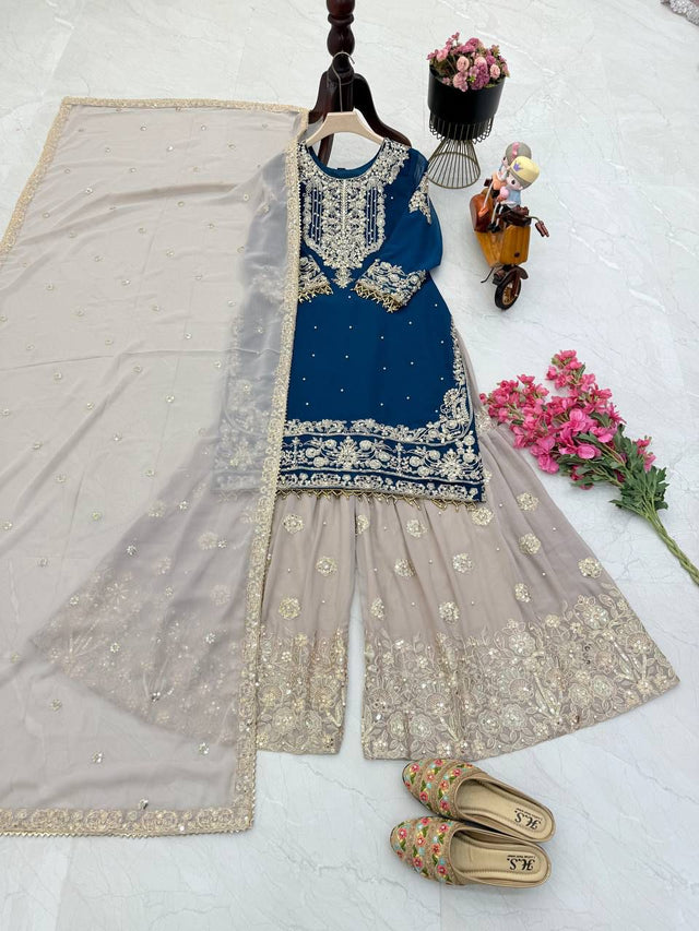 Glimmering Georgette Teal Blue Color Sharara Suit