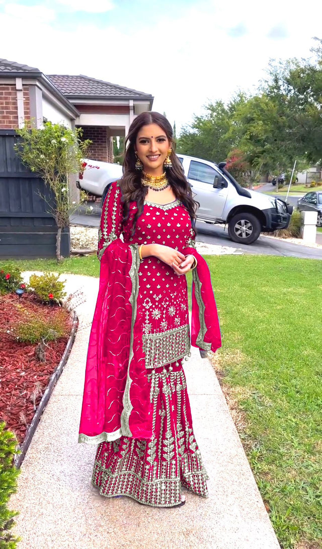 Glimmering Heavy Embroidery Sequence Work Pink Color Sharara Suit