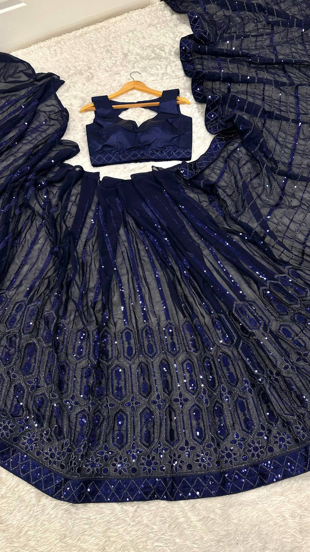 Glimmering Navy Blue Georgette Thread Work Saree