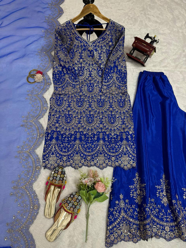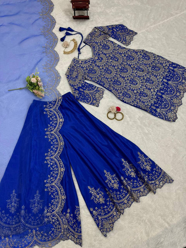 Glorious Blue Chinon Silk Sequence Work Palazzo Suit