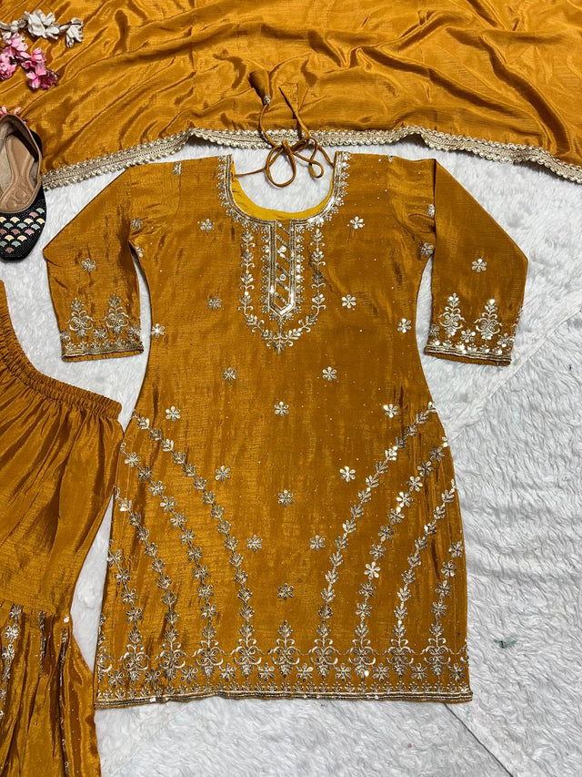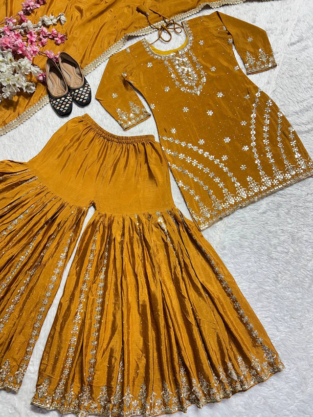 Glorious Chinnon Silk Mustard Color Sharara Suit