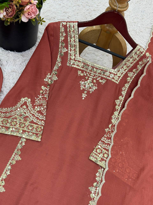 Brown Chiffon with Embroidery Work Palazzo Suit