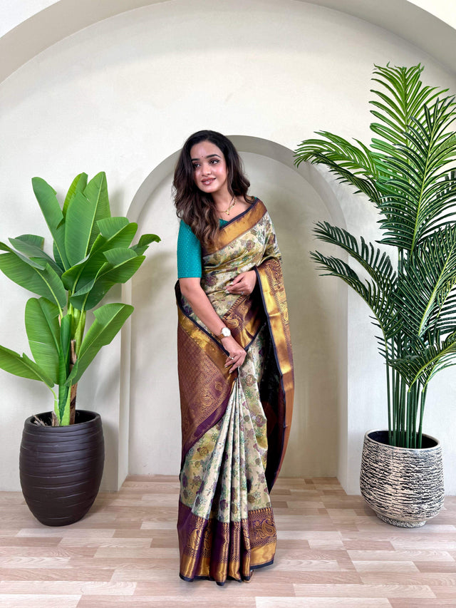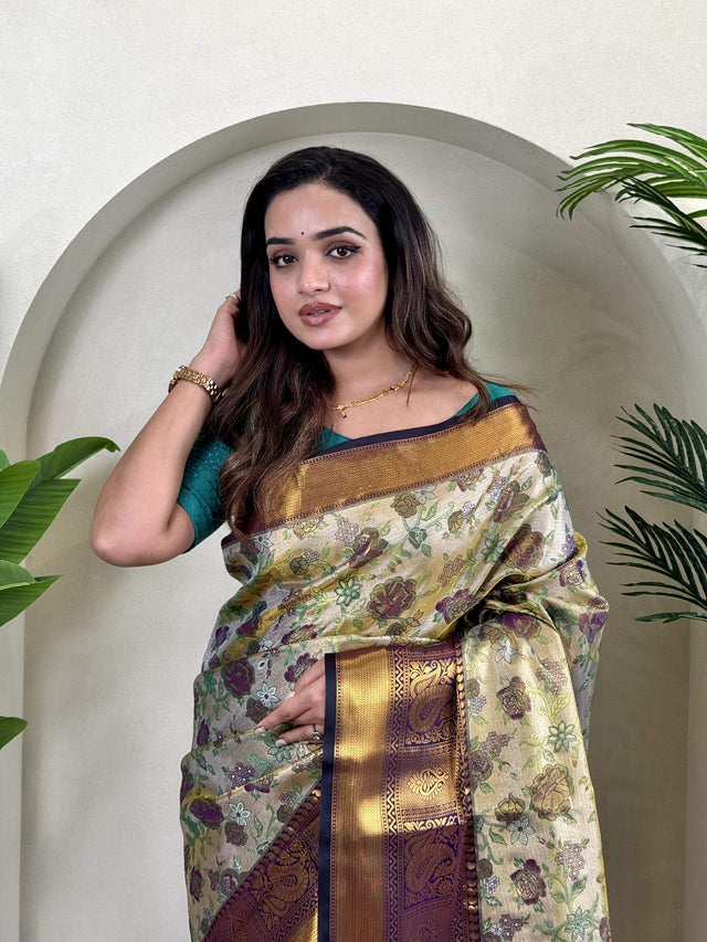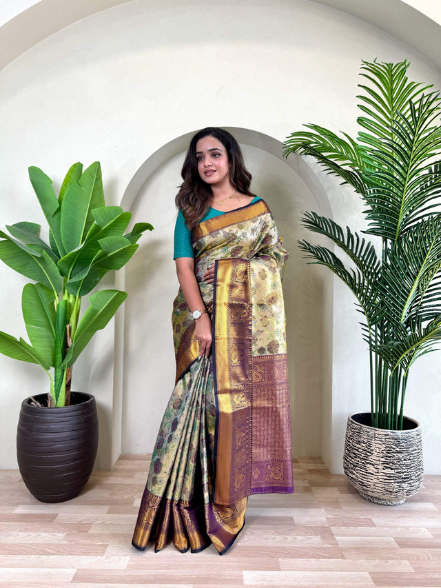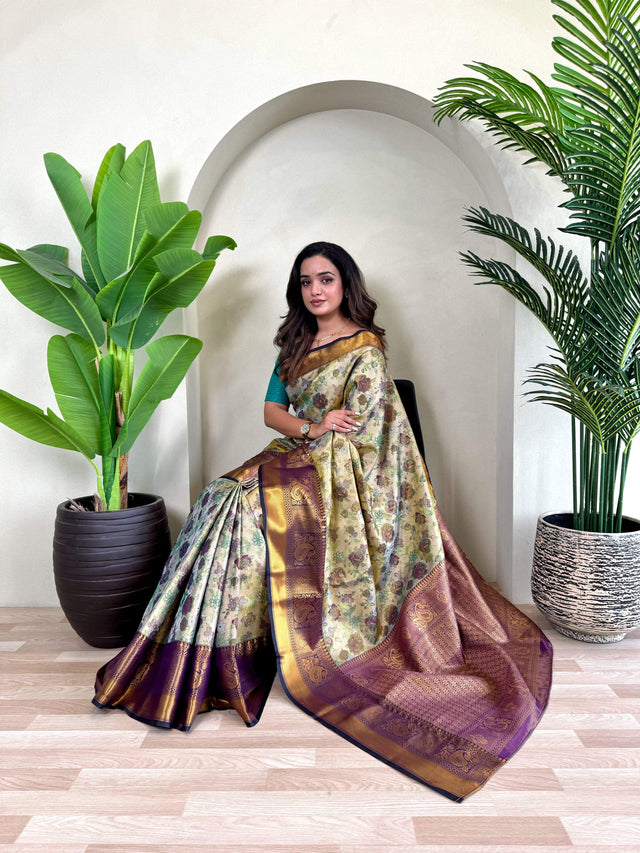 Kanchipuram Silk Sarees with Golden Zari Weaving all over saree with Rich Weaving Pallu, zari Border
