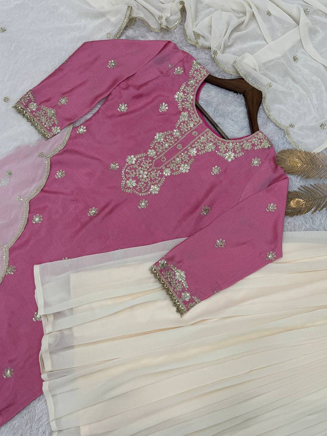 Glorious Pink Chinon Silk Sequence Work Palazzo Suit