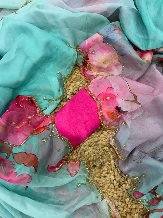Exuding grace and sophistication, this floral-printed organza saree blends classic beauty with modern elegance. Each delicate petal in the design tells a story of timeless charm, making it the perfect choice for those who appreciate both tradition and contemporary style.