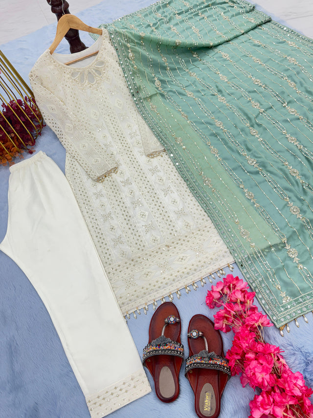 | Fabric | Heavy Faux Georgette With Embroidery 3 Mm Sequence Work With Four Side Real Mirror Hand Work With Rivet Moti Work With Fancy Latkan |