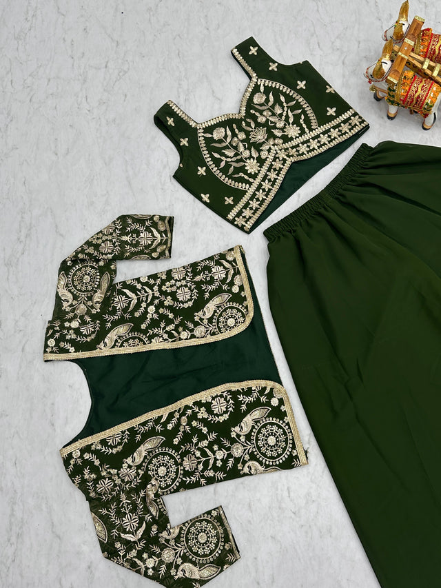 Glossy Georgette Lace Work Mehndi Color Palazzo Suit With Koti