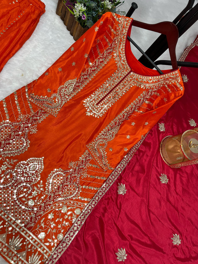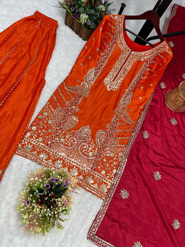 Glossy Orange Color Chinon Silk Palazzo With Dupatta Set