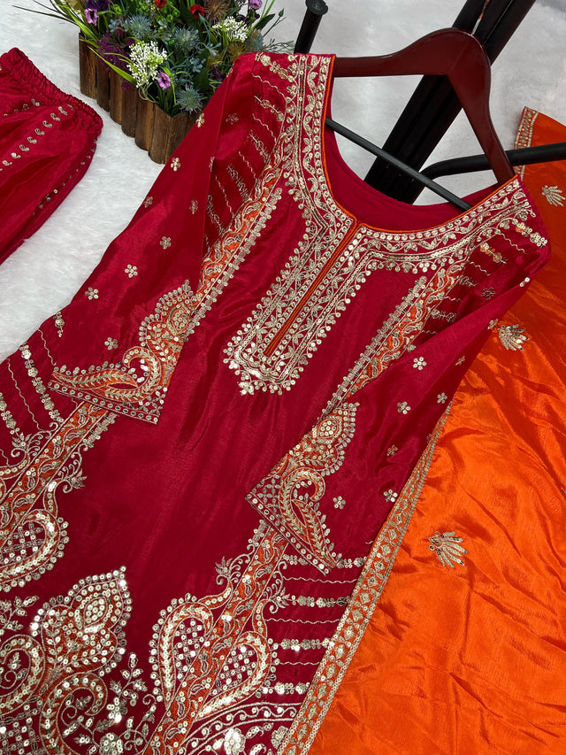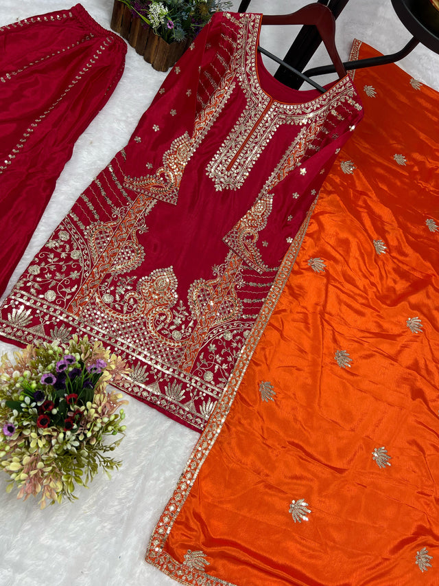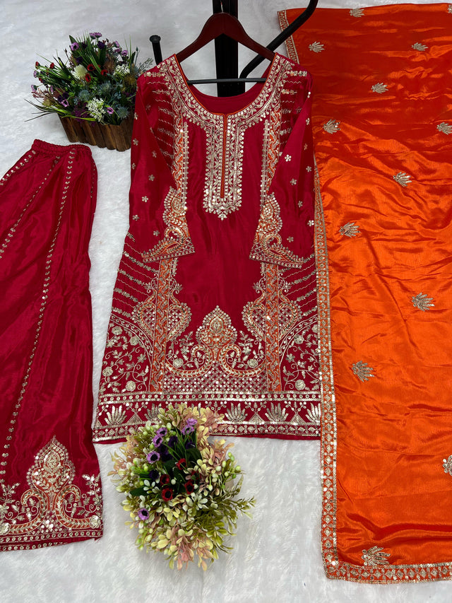 Glossy Red Color Chinon Silk Palazzo With Dupatta Set