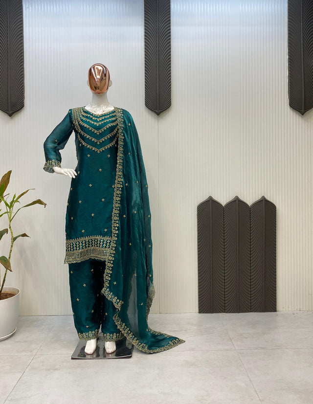 Good Looking Embroidery Work Teal Green Color Palazzo Suit