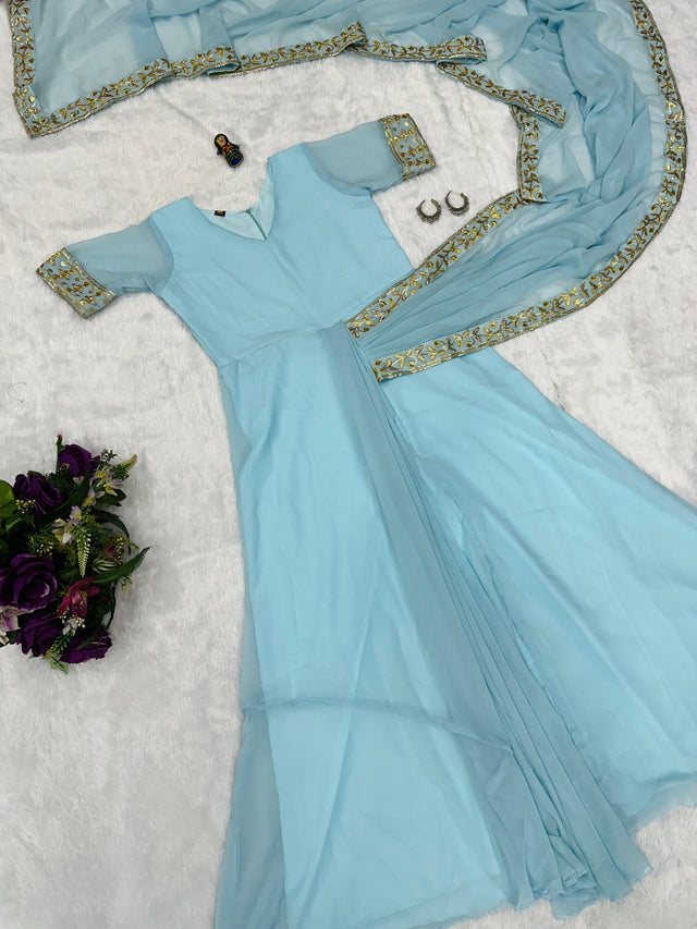 Good Looking Embroidery Work Sky Blue Color Saree Gown