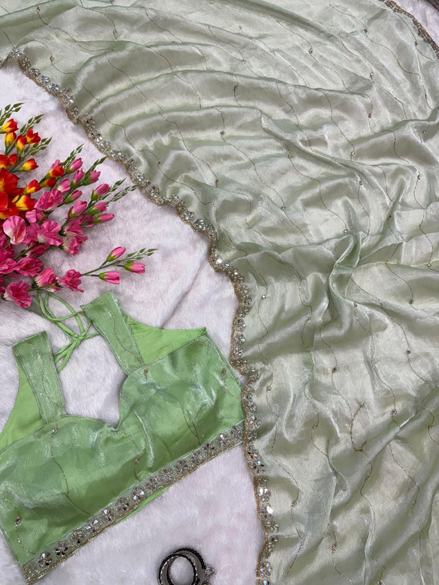 | Saree Fabric | Premium Jimmy Chu Silk Embellished With Beautiful Glitter Dori Work And Real Mirror Work |