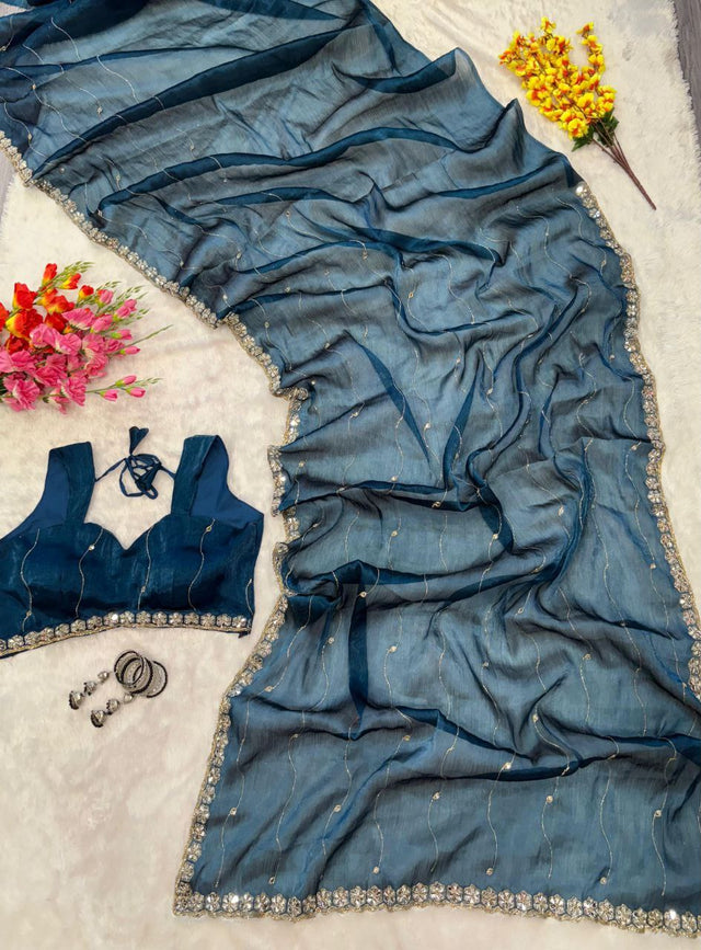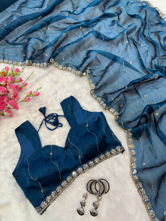 | Saree Fabric | Premium Jimmy Chu Silk Embellished With Beautiful Glitter Dori Work And Real Mirror Work |