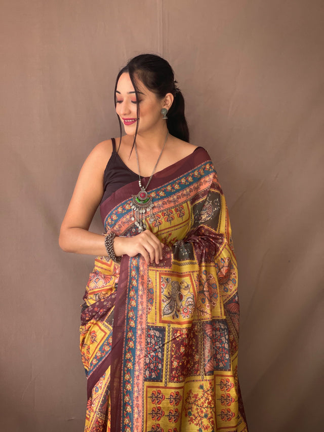 | Saree Work | Kalamkari Prints And Contrast Pallu With Tassels Attached |