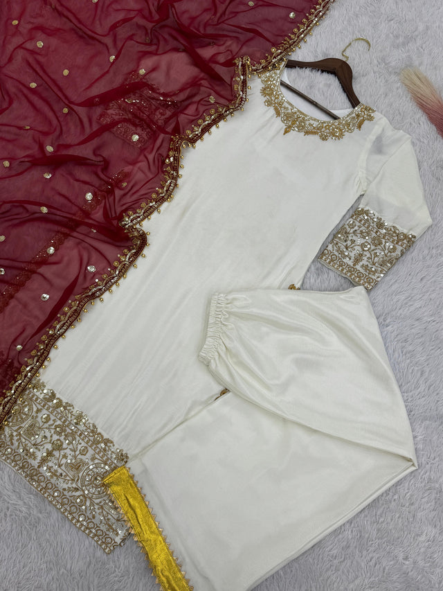Good Looking Sequin Work White Color Top Palazzo With Dupatta