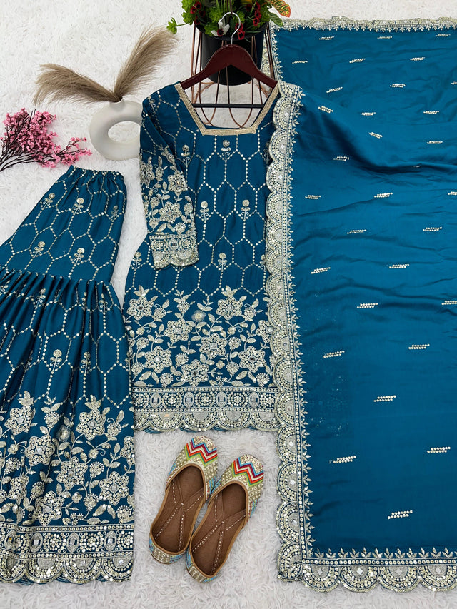 Gorgeous Embroidery Sequence Work Teal Blue Color Sharara Suit